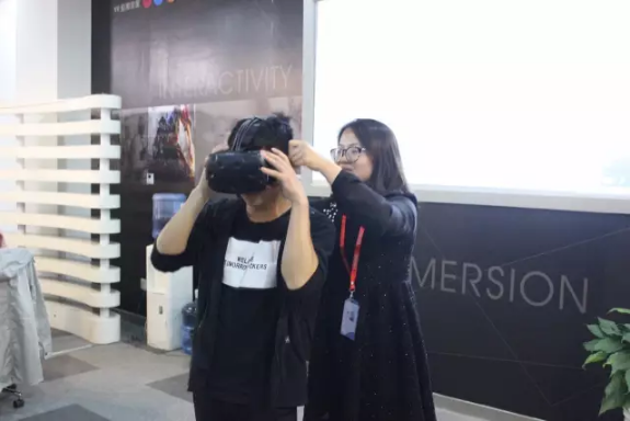 男同学对于虚拟游戏特别感兴趣,都想到带上VR眼睛感受一下,但是因为时间原因,大家只好依依不舍的参观下一个项目。
